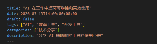 Hugo 提供了 archetypes 功能,可以初始化一些模板,你也可以通过 Hugo 使用手册来看一下个性化定制参数,比如描述、标签、分类等等