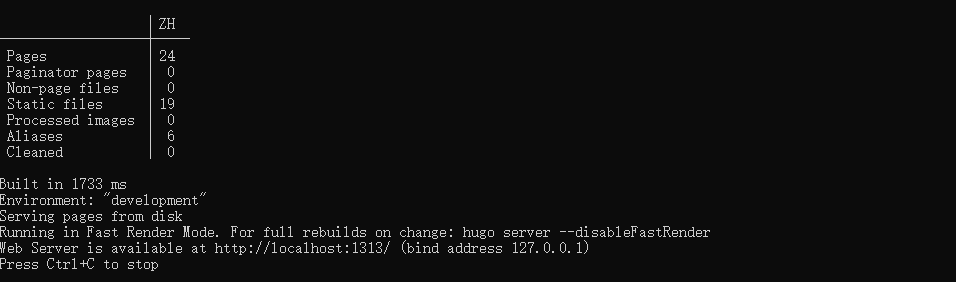 接下来输入 hugo new site 你的站点名称 ,之后 cd 你的站点名称进入文件夹,hugo server 启动站点,默认是 localhost:1313,到这一步你的 hugo 基础配置已经搭建完毕!